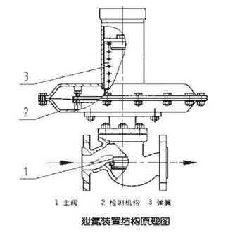 供氮裝置結構如右圖所示,將設在罐頂?shù)娜狐c的介質經(jīng)導壓管引入檢測機構(7)、介質在檢測元件上產(chǎn)生一個作用力與彈簧(8)、預緊力相平衡。當罐內壓力降低到低于供氮裝置壓力設定點時,平衡被破壞,使指揮器閥芯(6)打開,從而使閥前氣體經(jīng)減壓閥(5)、節(jié)流閥(4)、進入主閥執(zhí)行機構(3)上、下膜室,打主開閥閥芯(2)、向罐內充注氮氣;當罐內壓力升到供氮裝置壓力設定點時,由于預設彈簧力,關閉指揮器閥芯(6)又由于主閥執(zhí)行機構中彈簧作用,關閉主閥,停止供氮。
